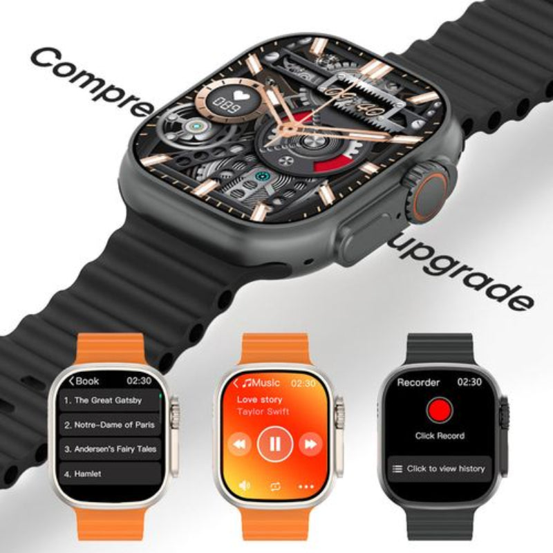 Additionally, the package includes a variety of watch bands in different colors and materials, allowing for customization. There are also charging accessories, such as a USB cable and a magnetic charging dock. The overall presentation suggests a focus on versatility and style, catering to users who appreciate both functionality and aesthetics in wearable technology.