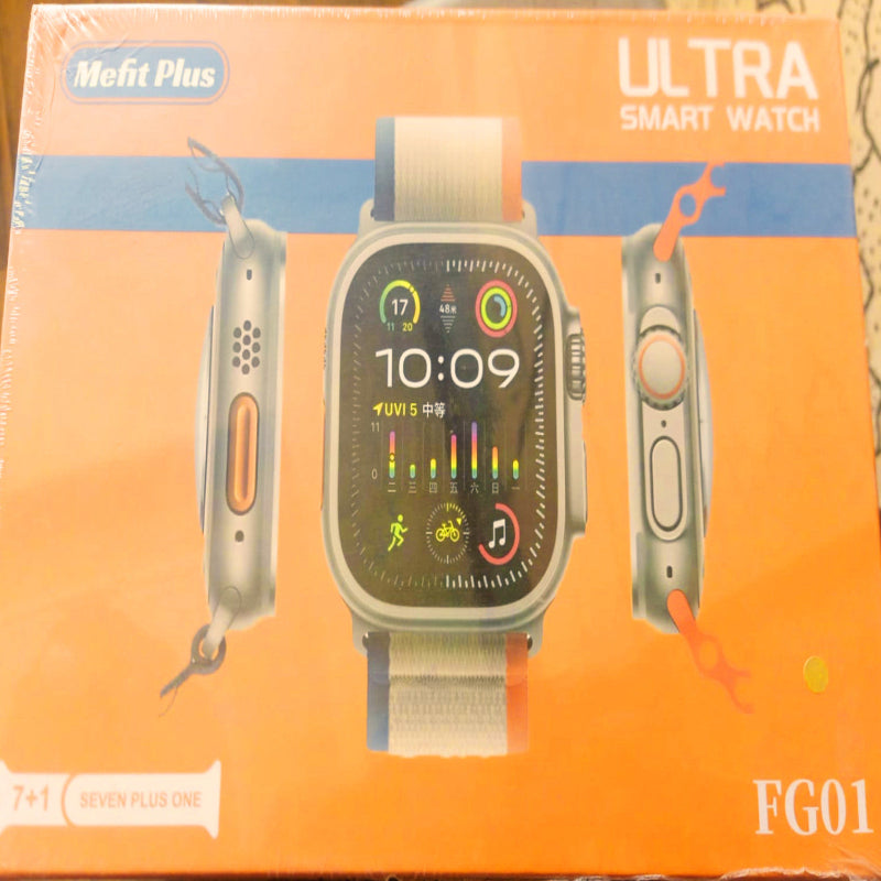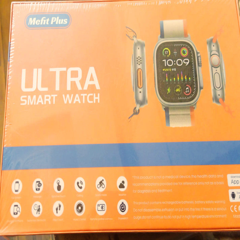 The image depicts a packaging for the "Ultra Smart Watch" by Meft Plus. The box features various icons indicating the watch's functionalities, such as: